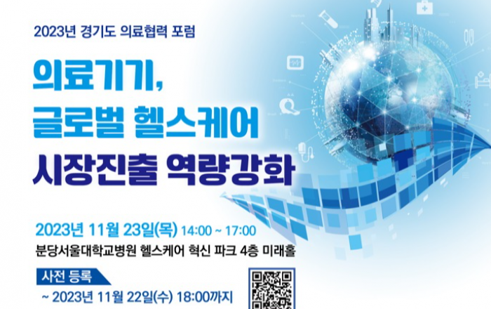 경기도가 23일 분당서울대학교병원 헬스케어혁신파크 미래홀에서 ‘의료기기, 글로벌 헬스케어 시장진출 역량강화’를 주제로 경기도 의료협력 정기포럼을 개최한다. 도가 주최하고, 분당서울대학교병원이 주관하는 이번 행사는 병원 중심의 의료산업 분야 네트워크를 구축해 현