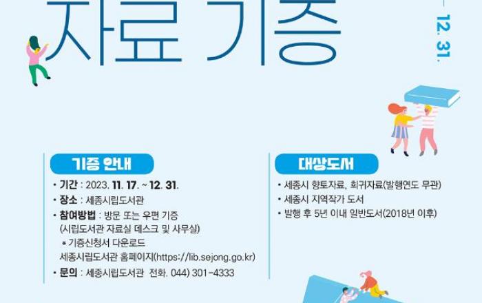 세종시립도서관이 지역 향토 자료 수집과 장서 확충을 위해 오는 12월 31일까지 지역향토자료 기증 운동을 집중 전개한다. 시립도서관은 도서관 4층에 향토자료실을 마련하고, 이번 기증 운동을 통해 세종시의 역사, 문화, 인물 등과 관련된 보존·가치 있는 향토자료와 지