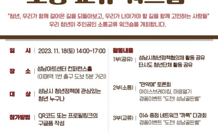성남시는 오는 11월 18일 오후 2시~5시 성남아트센터 컨퍼런스홀에서 청년정책협의체 소통·교류 워크숍을 개최한다. 이날 성남시 청년정책협의체 위원들과 서울·경기·이천·시흥·원주 청년 등 80여 명이 모여 활동 사례를 공유하고, 청년정책의 발전 방안을