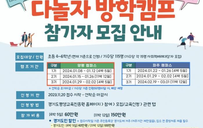 경기도와 경기도평생교육진흥원은 내년 1월부터 운영되는 경기미래교육캠퍼스 겨울방학돌봄 프로그램인 ‘다놀자 방학캠프’ 참가자를 20일부터 모집한다. ‘다놀자 방학캠프’는 초등학교 4학년~6학년 학생들을 대상으로 방학기간 돌봄과 교육, 관광체험활동