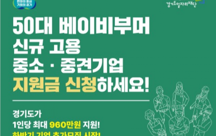 경기도와 경기도일자리재단은 도내 중장년층 구직자를 위한 안정된 일자리 기회 제공과 중소기업의 인력난 해소를 위해 ‘경기도 적합직무 고용지원금’ 사업의 하반기 참여기업을 오는 9월 20일까지 선착순 모집한다. 이 사업은 50대 도민을 경기도형