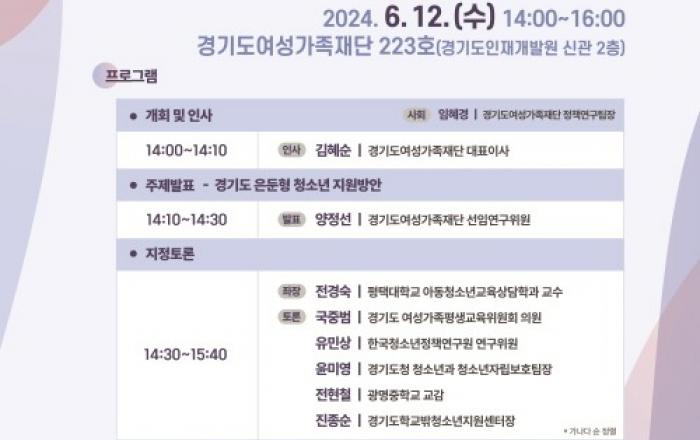 경기도여성가족재단이 경기도 은둔형 청소년 지원방안 연구결과를 바탕으로 향후 정책 방향을 논의하기 위해 12일 재단 회의실에서 제4차 경기GPS(Gender Policy Seminar)를 개최한다. 이날 포럼에서는 청소년기의 은둔에 대한 인식과