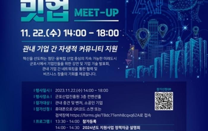 군포산업진흥원은 오는 11월 22일(수)에 관내 중견.중소벤처기업, 창업기업, 소공인기업들이 모두 모이는 네트워킹 행사인 '2023년 비즈니스 밋업(Meet Up)'을 개최한다. 이번 행사를 통해 관내 기업 협력 네트워킹을 활성화하고, 사업 기회창출, 기업 간 판로