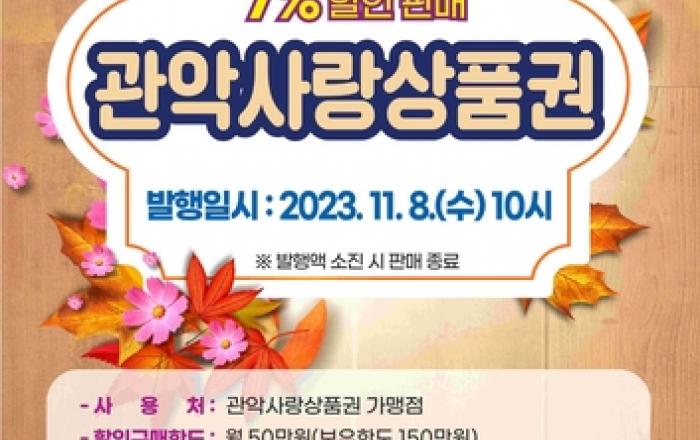 관악구가 구민들의 물가 부담을 덜어주고, 지역 내 소비 촉진으로 지역상권에 활력을 불어넣기 위해 관악사랑상품권 125억 원을 추가 발행한다. 이번 상품권 발행 할인율은 7%로, 할인율에 대한 보전금 전액은 관악구가 부담한다. 상품권 구매는 오는 11월 8일(수)