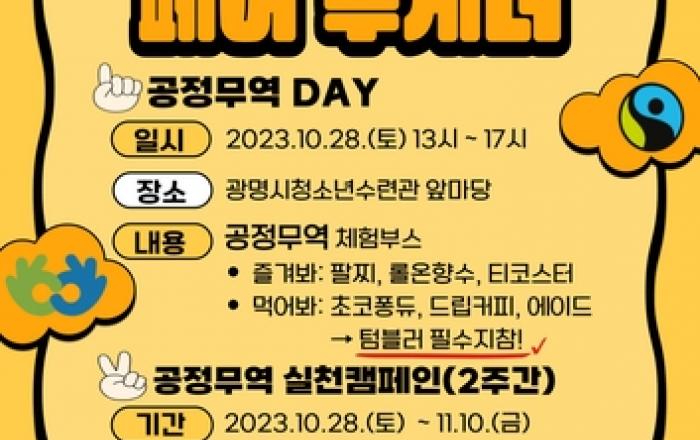 광명시가 시민의 공정무역 참여와 실천을 독려하고 공정무역 활성화를 도모하기 위해 '2023년 광명시 공정무역 2주간 축제(포트나잇)'을 개최한다. 시는 이번 축제의 주제를 공정무역도시 시민의 자부심을 높이고 광명시 공정무역의 미래를 밝혀 날로 발전하자는 취지를 담아