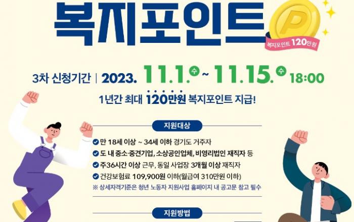 경기도가 도내 청년 노동자들의 복리후생 개선과 일자리 미스매치 해소를 위한 ‘청년 복지포인트’ 3차 참여자 1만 명을 11월 1일부터 15일까지 공개 모집한다. ‘청년 복지포인트’ 사업은 경기도 소재 중소․중견기업, 소상공인