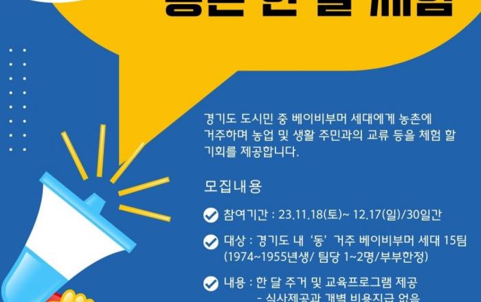 경기도와 경기도농수산진흥원이 운영하는 경기도귀농귀촌지원센터가 ‘경기도 베이비부머 농촌 한 달 체험’ 참여자를 모집한다. 경기도 베이비부머 농촌 한 달 체험은 도시에 거주하는 베이비부머 세대(1974~1955년생) 귀농·귀촌 준비자가 실제 농촌