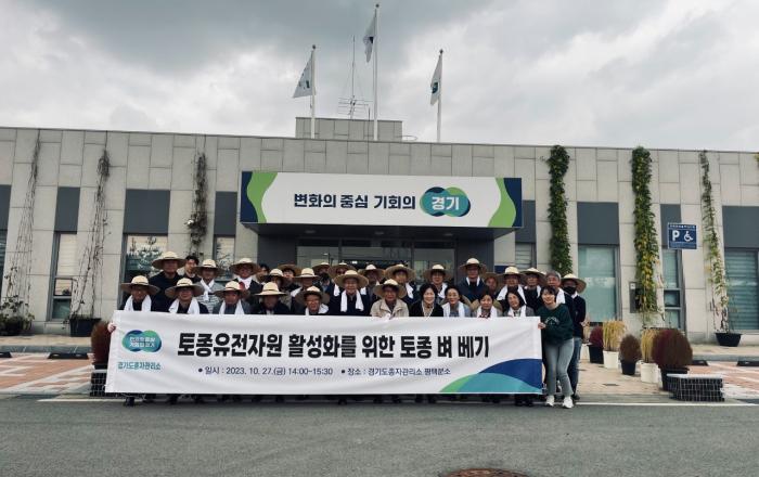경기도는 27일 평택시 고덕면 소재 경기도종자관리소 평택분소에서 ‘토종 벼 베기 시연 행사’를 열었다. 이날 벼 베기 한 토종 벼는 ‘붉은차나락’으로 붉은 잎을 가진 찰벼(차나락)에서 이름이 유래됐으며, 어린 모 시기부터 성숙기까지 붉은색 이파