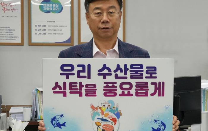 신상진 성남시장이 24일 ‘수산물 소비·어촌휴가 장려 챌린지’ 캠페인에 동참했다. 박경귀 아산시장의 지명을 받아 챌린지에 참여한 신상진 시장은 이날 ‘우리 수산물로 식탁을 풍요롭게’라는 문구와 함께 촬영한 인증사진을 개인 사회관계망서비스(SNS)에 게재하였다.