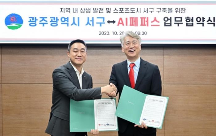 광주광역시 서구와 AI페퍼스 여자프로배구단이 '스포츠도시 서구' 실현을 위해 손을 맞잡았다. 김이강 서구청장과 김동언 AI페퍼스 배구단장은 20일 오전 서구청 나눔홀에서 상생발전을 위한 업무협약을 체결했다. AI페퍼스 배구단은 홈경기장인 페퍼스타디움을 서구에 두고