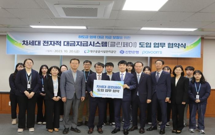대구공공시설관리공단은 10월 20일(금) 신한은행과 올바른 대금 지급 문화정착을 위한 차세대 전자적 대금 지급 시스템 '클린페이' 도입 업무협약(MOU)을 체결했다. 대구공공시설관리공단은 2022년 10월 1일 출범해 깨끗하고 쾌적한 환경시설물 관리로 시민이 체감하