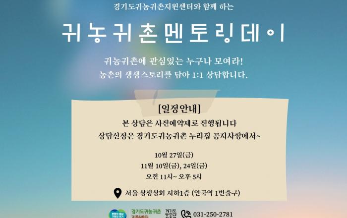 경기도와 경기도농수산진흥원이 운영하는 경기도귀농귀촌지원센터에서는 10월 27일 ‘행복멘토링 데이’를 시작으로 총 3회에 걸쳐 서울시 종로구 상생상회에서 ‘2023년도 2차 찾아가는 귀농귀촌 상담실’을 운영한다. 이 상담실에서