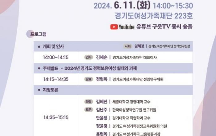 경기도여성가족재단이 경기도 경력보유여성등의 경제활동 현황을 토대로 향후 정책 방향을 논의하기 위해 11일 재단 회의실에서 제3차 경기GPS(Gender Policy Seminar)를 개최한다. 경기도여성가족재단 공식 유튜브