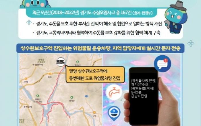 경기도 교통정보센터가 팔당 상수원보호구역을 운행하는 위험물질 운송차량 위치정보를 경찰서 및 수자원본부 등 담당자에게 전송하는 서비스를 진행한다. 상수원보호구역에는 사전 인가된 위험물질 운송차량만 운행할 수 있지만 위반차량에 대한 정보는 전혀 알