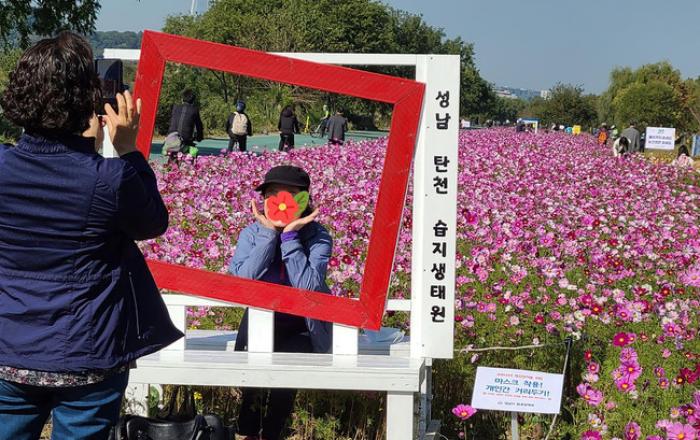 성남시 수정구 태평동 탄천 태평습지생태원에 백만송이 코스모스길이 4,200㎡ 규모로 펼쳐져 눈길을 끈다.지난 8월 말 뿌린 코스모스 씨앗(50㎏)이 자라 최근 하나둘 꽃을 피워 가을 정취를 전하고 있다. 바람결에 일렁이는 코스모스는 쪽빛 가을하늘과 어우러져서 장관이