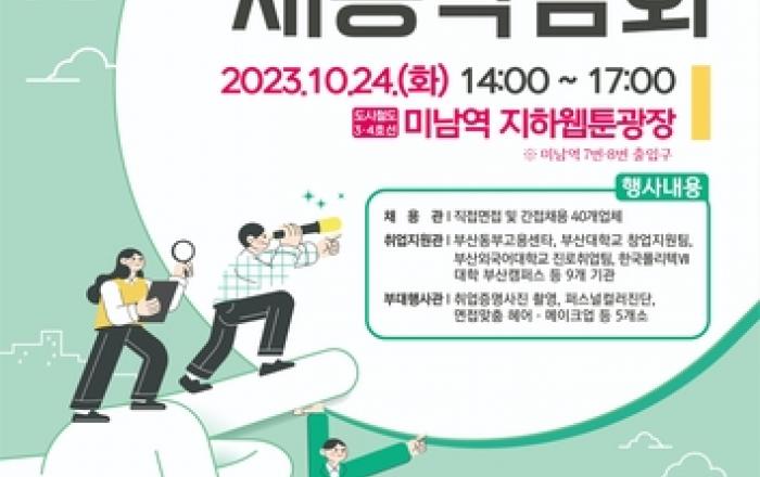 부산 동래구는 10월 24일 오후 2시∼5시, 도시철도 미남역 지하웹툰광장에서 취업을 희망하는 청년, 중장년 등 전 연령층을 대상으로 '다함께 나누는 좋은 일자리! 2023. 동래구 채용박람회!'를 개최한다고 밝혔다. 이번 채용박람회는 구직자에게 다양한 취업기회 제