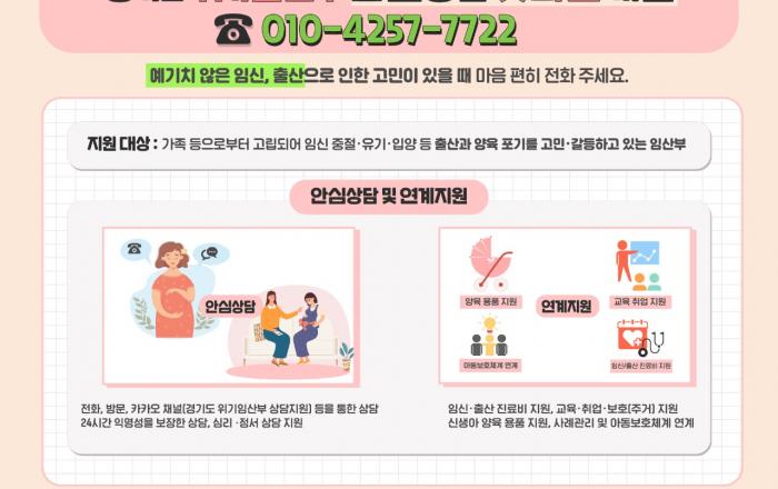 경기도가 예기치 않은 임신과 출산 등으로 고민하는 미혼모 등 위기에 놓인 임산부라면 누구나 24시간 익명으로 상담을 받을 수 있는 위기임산부 안심상담 핫라인(010-4257-7722)을 개설하고 13일부터 운영에 들어간다.