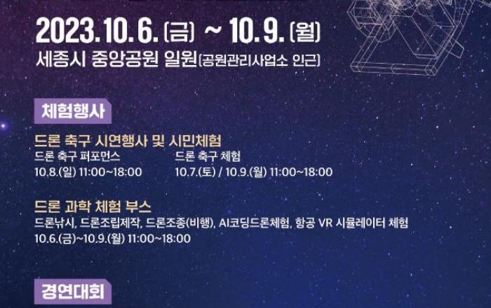 드론으로 정해진 코스를 빠른 속도로 통과하는 레이싱 대회와 드론 축구 시범경기는 물론, 드론을 활용한 다양한 과학 체험이 가능한 ‘2023 세종과학집현전’이 세종중앙공원을 배경으로 펼쳐진다. 세종특별자치시가 주최하고 (재)세종테크노파크가 주관하며 K-드