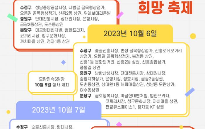 성남시는 오는 10월 5일부터 7일까지 3일간 성남시 주요 전통시장과 상점가에서 ‘2023 성남시 희망 축제’를 개최한다.시 승격 50주년 기념사업의 일환으로 열린 이번 축제는 36개 상인회와 공동으로 개최되며 전통시장 및 골목상권 활성화를 위해 마련됐다.