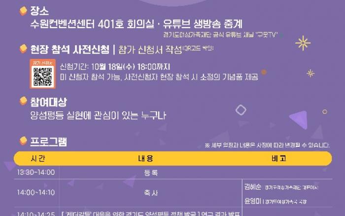 경기도여성가족재단 경기도양성평등센터가 10월 26일 오후 2시 수원컨벤션센터 401호 회의실에서 ‘양성평등, 모두에게 기회를’이라는 주제로 청년 공감 토론회를 개최한다. 9월 28일부터 경기도여성가족재단 누리집(www.gwf