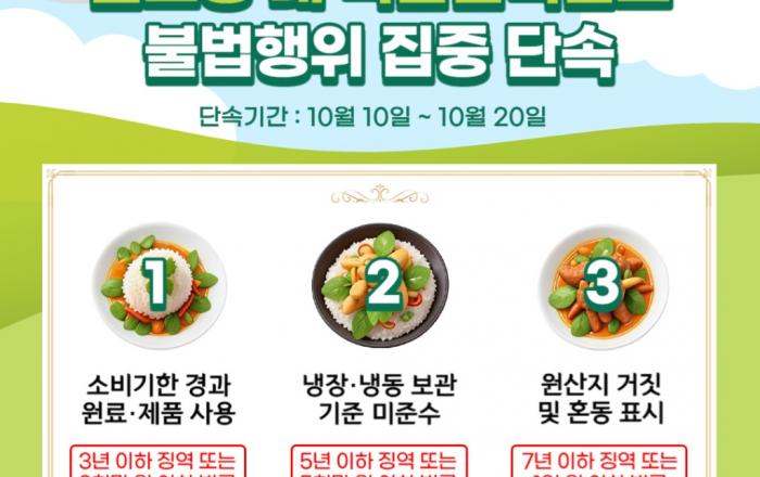 경기도 특별사법경찰단은 10월 10일부터 20일까지 화성시 등 12개 시군 골프장 내 클럽하우스 등 식품접객업소 150곳을 대상으로 불법행위를 집중 단속한다. 주요 단속내용은 ▲소비기한 경과 원료 또는 완제품을 조리‧판매 목적으로 보관하거나 조