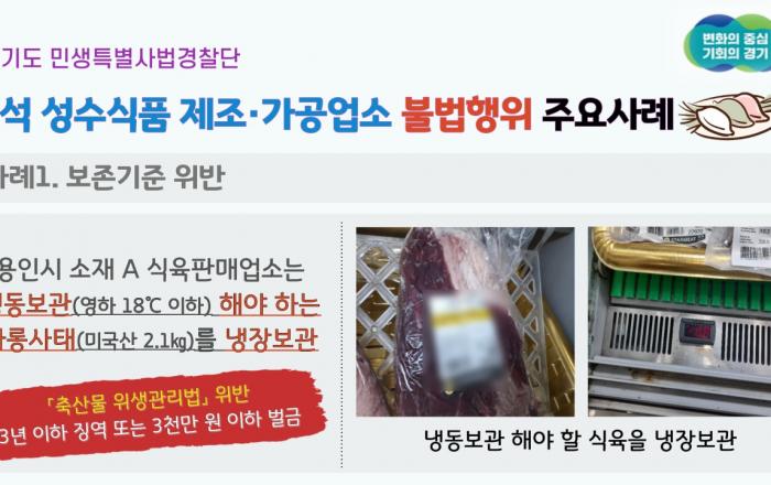 ※ 보도 자료에 공개된 범죄사실은 재판을 통해 확정된 사실이 아님을 유의해 주시기 바랍니다.(보도사유 : 동종 범죄․피해의 급속한 확산 방지) 경기도 민생특별사법경찰단은 추석 명절을 앞두고 지난 8월 28일부터 9월 8일까지 도내 식품제조가공업