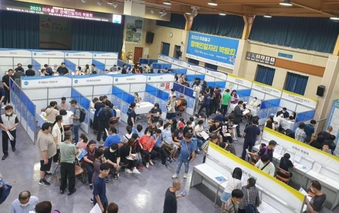 인천 미추홀구는 지난 19일 인천미추홀장애인종합복지관, 한국장애인고용공단 인천지사와 함께 '좋은 일자리! 잡(JOB)아라! 2023 미추홀구 장애인 일자리 박람회'를 구청 대회의실에서 개최했다. 이번 박람회에서는 인하대학교, 가톨릭대학교 인천성모병원, ㈜에프앤씨시스
