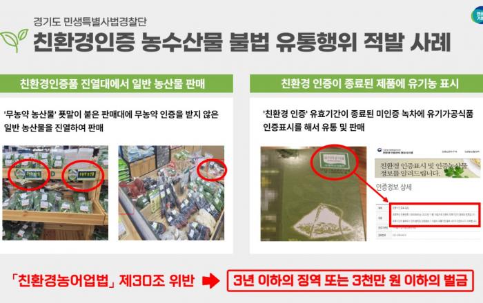 ※ 보도 자료에 공개된 범죄사실은 재판을 통해 확정된 사실이 아님을 유의해 주시기 바랍니다.(보도사유 : 동종 범죄․피해의 급속한 확산 방지) 친환경 농수산물이 아닌데도 유기농, 무농약, 무항생제 농수산물인 것처럼 허위 광고하는 등 불법행위를