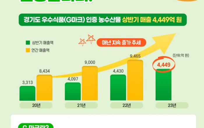 신선하고 안전한 농수산물을 찾는 소비가 꾸준히 늘면서 경기도 우수식품 인증인 G마크 매출액도 지속적으로 증가하고 있는 것으로 나타났다. 경기도는 올해 상반기 G마크 매출액이 4,449억 원으로 집계됐다고 14일 밝혔다. 경기도 G마크 매출액은