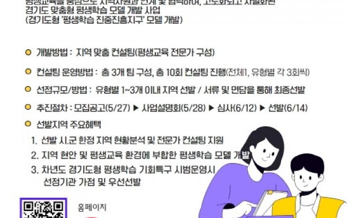 경기도평생교육진흥원이 지역 평생교육 활성화를 위한 ‘경기도형 평생학습 기회특구 모델 개발 컨설팅’에 참여할 시‧군을 6월 10일까지 모집한다. ‘경기도형 평생학습 기회특구 모델 개발 컨설팅’은 사회 변화와 평생학습 환경에 맞