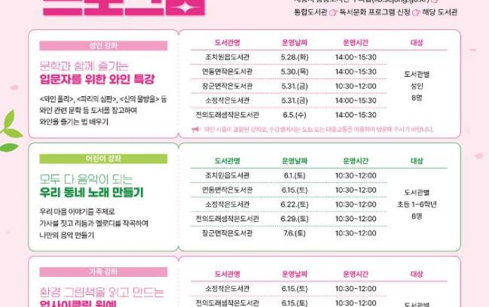 세종시립도서관이 28일부터 공립작은도서관 5곳에서 ‘2024년 상반기 독서문화 프로그램’을 진행한다. 이번 상반기 프로그램은 성인과 어린이 160명을 대상으로 3개월간 소정, 연동면, 장군면, 전의도래샘, 조치원읍 등에서 차례로 열린다. 프로그램은 ‘입문자를 위