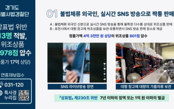 ※ 보도 자료에 공개된 범죄사실은 재판을 통해 확정된 사실이 아님을 유의해 주시기 바랍니다.(보도사유 : 동종 범죄․피해의 급속한 확산 방지) 인적이 드문 외진 곳에 위치한 매장에서 가짜명품을 판매한 불법체류자 신분의 외국인과 짝퉁을 대량으로