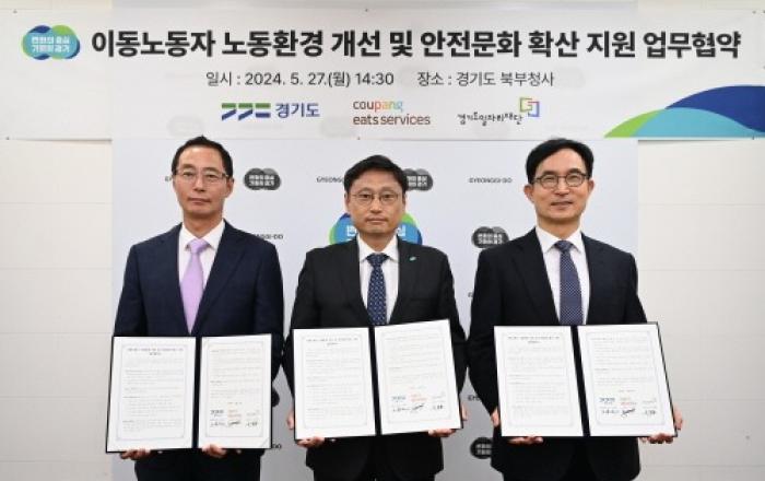 경기도는 27일 경기도청 북부청사에서 경기도일자리재단과 온라인 음식 배달 서비스기업인 쿠팡이츠서비스와 함께 이동노동자 노동환경 개선과 안전 문화 확산을 위한 업무협약을 체결했다. 협약에 따라 세 기관은 이동노동자 노동환경 및