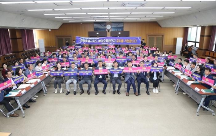 아시아의 바이오 산업 메카를 꿈꾸는 정읍시가 정부의 바이오특화단지 공모 선정을 한 달 앞둔 시점에서 유치 기원 퍼포먼스를 선보였다. 시는 27일 시청 대회의실에서 이학수 시장과 실과소장 및 읍면동장, 직원 등 100여명이 참여한 확대간부회의를 열고 이 자리에서 바