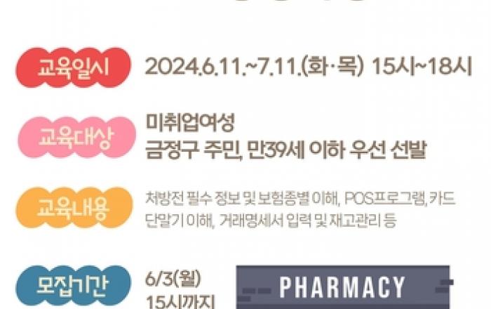부산시 금정구는 동래여성인력개발센터와 협력해 경력 단절 및 미취업 여성의 취업률 증가를 위한 '약국 사무원 양성 사업' 지원자를 모집한다. 약국 사무원 양성 사업은 여성 취업률이 높은 약국 사무 직종 직업훈련을 통해 여성의 경제활동 참여율 증대 및 고용유지율을 향상
