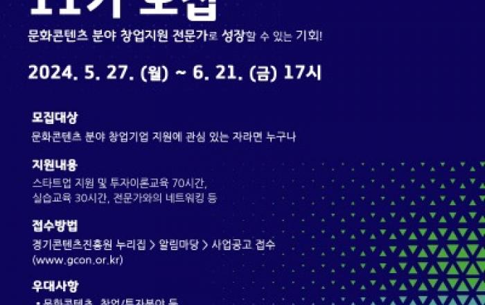 경기도가 문화콘텐츠 분야 창업지원 전문인력인 ‘문화창업플래너’ 11기 교육생을 6월 21일까지 모집한다고 27일 밝혔다. ‘문화창업플래너’ 프로그램은 창업아이디어를 구체화하고 투자유치 지원 등 창업에 필요한 전 과정을 밀착