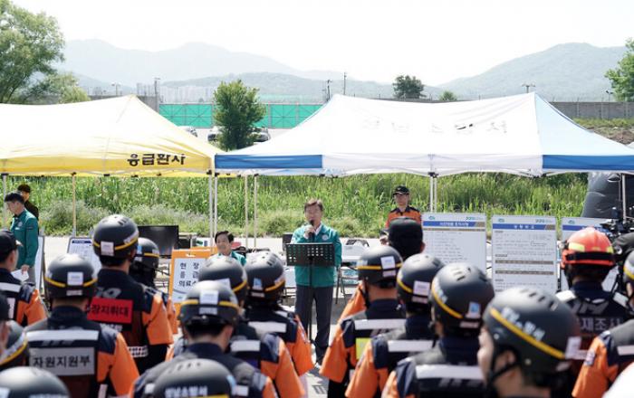 성남시가 23 일 국지성 집중호우에 따른 산사태 , 탄천 범람 , 저지대 침수 상황을 가정한