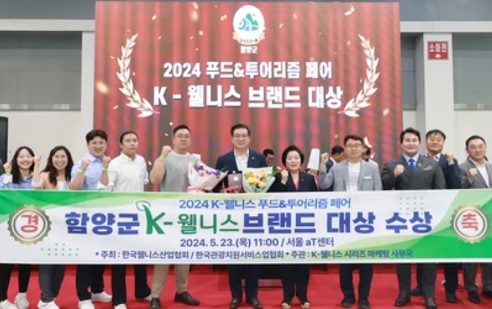 함양군이 5월 23일 서울 에이티(aT)센터에서 열린 '2024 K-웰니스 푸드&투어리즘 페어'에서 K-웰니스 브랜드 대상을 수상했다. (사)한국웰니스산업협회와 한국관광지원서비스업협회 주최로 23일부터 24일까지 열리는 K-웰니스 푸드&투어리즘 페어는 웰빙(Well