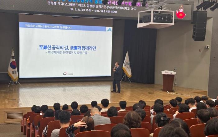 세종특별자치시가 지난 20일과 21일 이틀간 시청 여민실에서 전 직원을 대상으로 반부패·청렴교육을 했다. 이번 교육은 공직사회 자율적 청렴 역량 내재화를 목표로 국민권익위원회 청렴연수원의 김정환, 정승호 전문강사를 초빙해 진행했다. 교육