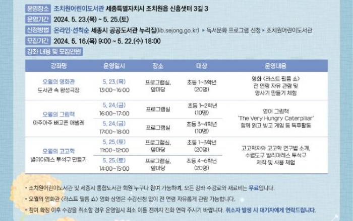 세종시립도서관이 5월 가정의 달을 맞아 23일부터 조치원어린이도서관에서 ‘오월의 도서관’ 독서문화 프로그램을 선보인다. 가정의 달 프로그램은 23일부터 오는 25일까지 어린이 200명을 대상으로 조치원어린이도서관 프로그램실과 앞마당에서 진행된다.