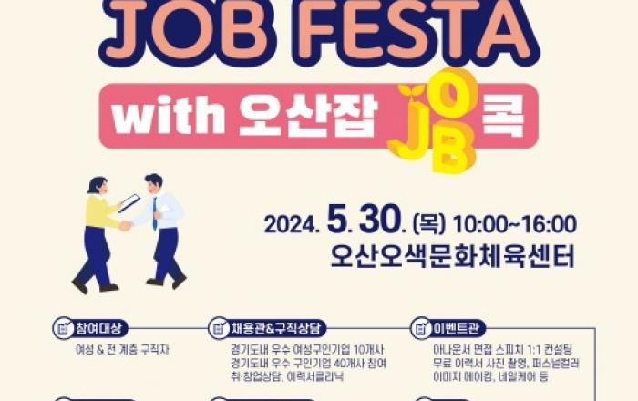 경기도와 경기도일자리재단은 오산시와 협력하여 5월 30일 오산시 오산오색문화체육센터에서 ‘2024년 경기여성잡페스타 with 오산잡(JOB)콕’ 취업박람회를 개최한다. 이번 취업박람회는 경기도와 오산시가 공동 주최하고 경기도일자리재단과 오산대학