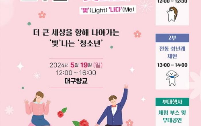 대구광역시는 5월 19일(일) 낮 12시 대구향교에서 ‘2024년 제52회 성년의 날 기념행사’를 개최한다. 대구행복진흥사회서비스원(청소년활동진흥센터)과 대구향교가 주관하는 이날 기념행사는 ‘스무살 : 빛나다’라는 주제로 청소년과 가족, 시민 등이 참석한 가운데 청소년