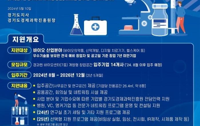 경기도가 바이오 분야 (예비)창업자를 위해 입주공간 등을 지원하는 내용의 ‘경기 바이오 스타트업 랩 운영 프로그램’을 올해부터 추진한다. 경기도와 경기도경제과학진흥원은 5월 10일부터 6월 10일까지 ‘경기 바이오 스타트업 랩 운영 프로그램’