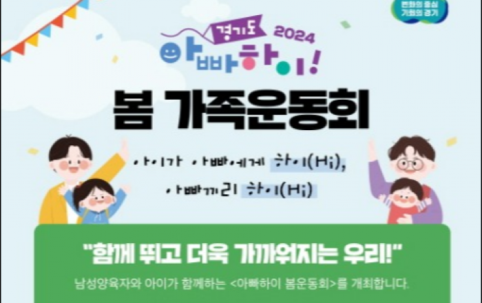 경기도여성가족재단이 11일 경기도인재개발원 야외운동장에서 ‘경기도 아빠하이! 및 인구인식개선’ 사업 5기 참여자 및 가족을 대상으로 봄 가족운동회를 개최한다. ‘경기도 아빠하이! 및 인구인식개선’ 사업은 남성 육아 일상성 정립 및 인식개선 캠페인을 통해 아이·