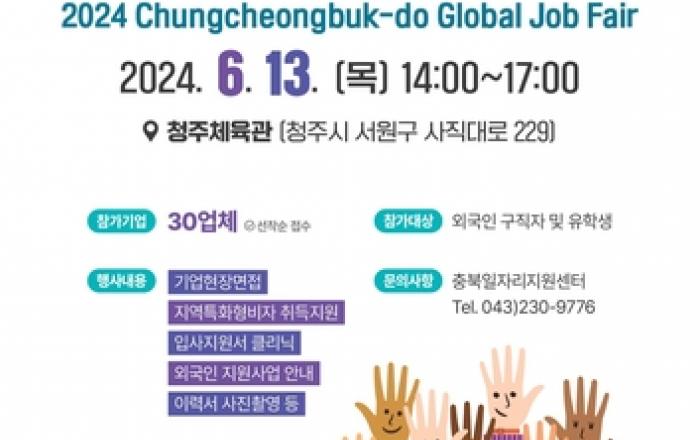 충북도는 오는 6월 13일 청주체육관에서 지역기업의 인력난 해소와 외국인 일자리 제공을 위해 '2024 충청북도 외국인 우수인재 채용박람회'를 개최한다고 8일 밝혔다. 이는 인구감소 대응과 지역경제 활성화를 위해 추진중인 '지역특화형 비자 사업'과 '숙련기능인력(K