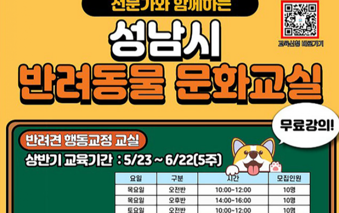 성남시가 올 상반기 반려동물 문화교실 신청을 이달 19 일까지 받는다. 성남시는 성숙한 반려동물 문화 조성을 위하여 반려동물 문화교실을 상반기와 하반기로 나누어 운