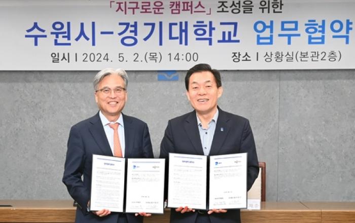 수원시가 경기대학교와 '지구로운 캠퍼스 조성을 위한 업무협약'을 체결하고, 탄소중립 실현을 위해 협력하기로 했다. 지난 2일 시청 상황실에서 열린 협약식에는 이재준 수원시장, 황인국 제2부시장, 이윤규 경기대학교 총장, 최병정 교학부총장, '지구로운 캠퍼스 조성 추