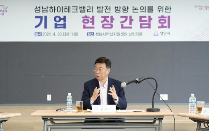 신상진 성남시장은 30 일 성남하이테크밸리의 발전 방향 논의를 위한 기업 현장간담회를 실시했다 . 이날 성남시혁신지원센터에서 열린 현장간담회에는 성남하이테크밸리에 입주한