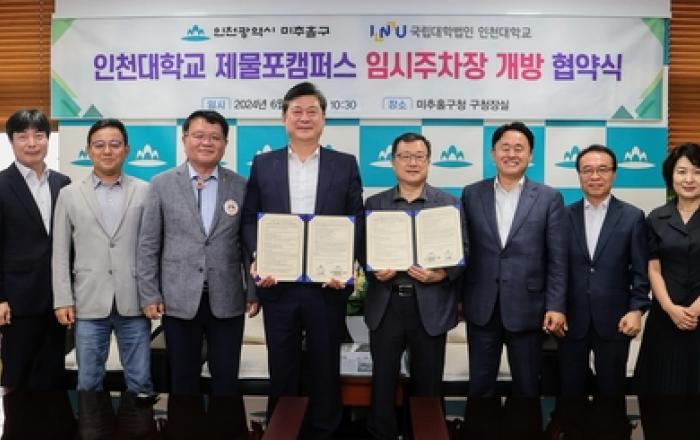 인천 미추홀구는 24일 구청장실에서 인천대학교(총장 박종태)와 '인천대학교 제물포캠퍼스 임시주차장 개방 협약식'을 체결했다. 구는 지역 내 주차난을 해소하기 위해 인천대와 주차장 개방을 위한 공감대를 형성하고 시기 및 운영 방법 등에 대해 꾸준히 협력을 해왔으며,