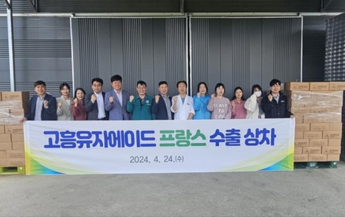고흥군은 24일 엔자임팜(대표 김주호)에서 고흥 유자에이드 프랑스 수출 상차식을 가졌다고 밝혔다. 이번 수출은 공영민 군수가 이끈 '고흥군 농수산물 유럽 수출개척단'이 지난 4월 초 프랑스 파리 출장을 통해 총 500만 달러(한화 68억 원) 규모의 수출협약 체결에